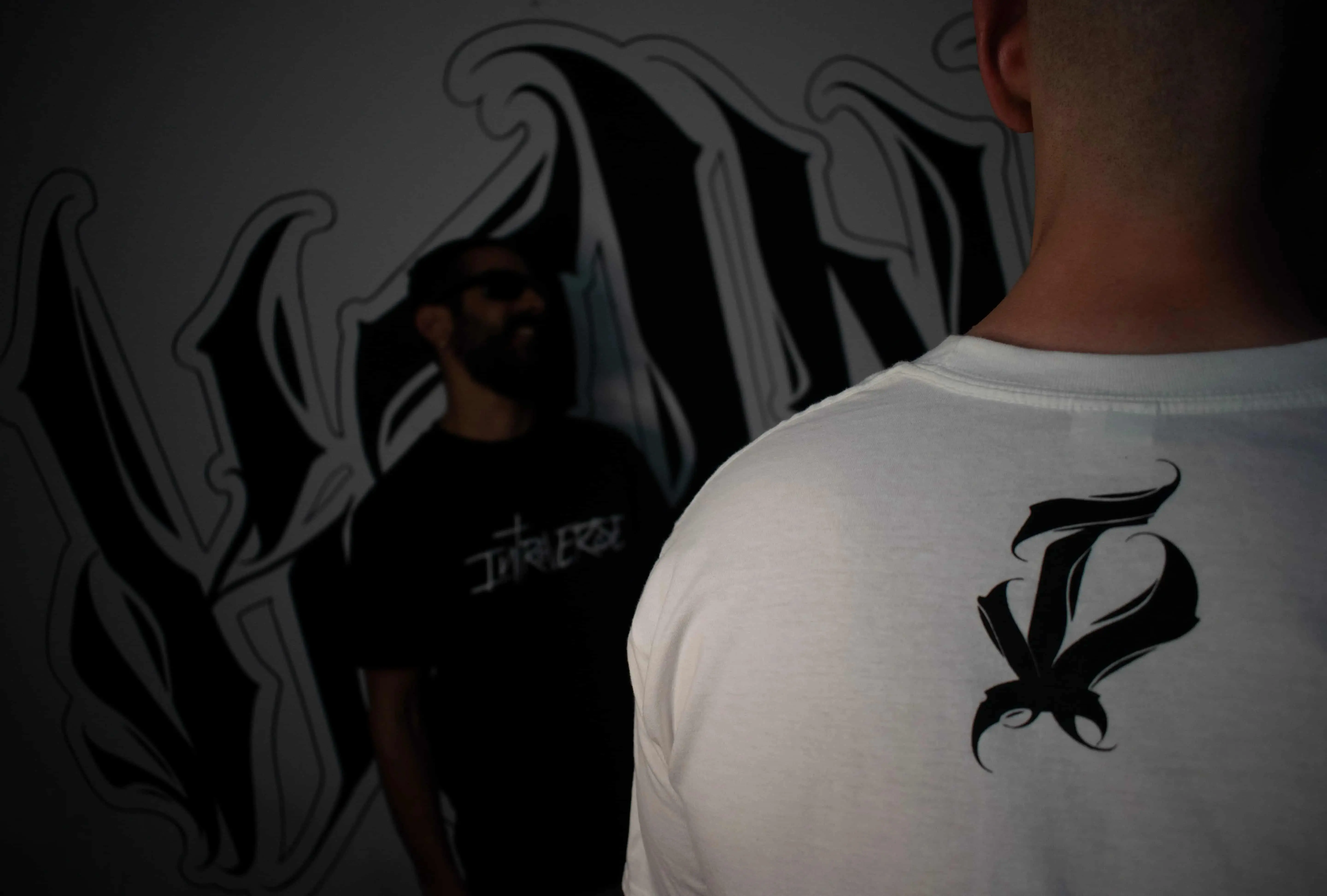 Two variants are offered: a black T-shirt with white logos, and a white T-shirt with black